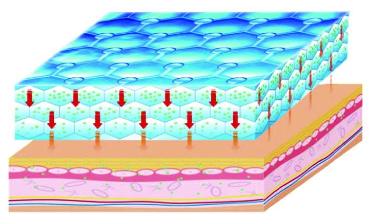 3.当贴近皮肤端的药物逐渐被吸收以后,远端的药物和水分子会沿着浓度梯度差转移过来继续被皮肤所吸收,保证药物持续稳定释放,发挥长效治疗作用。