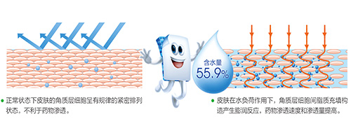 水分在药物突破皮肤角质层的过程中起到极其关键的作用,水分越充足保持时间越长,药物的渗透性也越好越持久。和心诺泰巴布剂 55.9% 的含水量是目前巴布剂中最高的,也是透皮吸收性最好的。